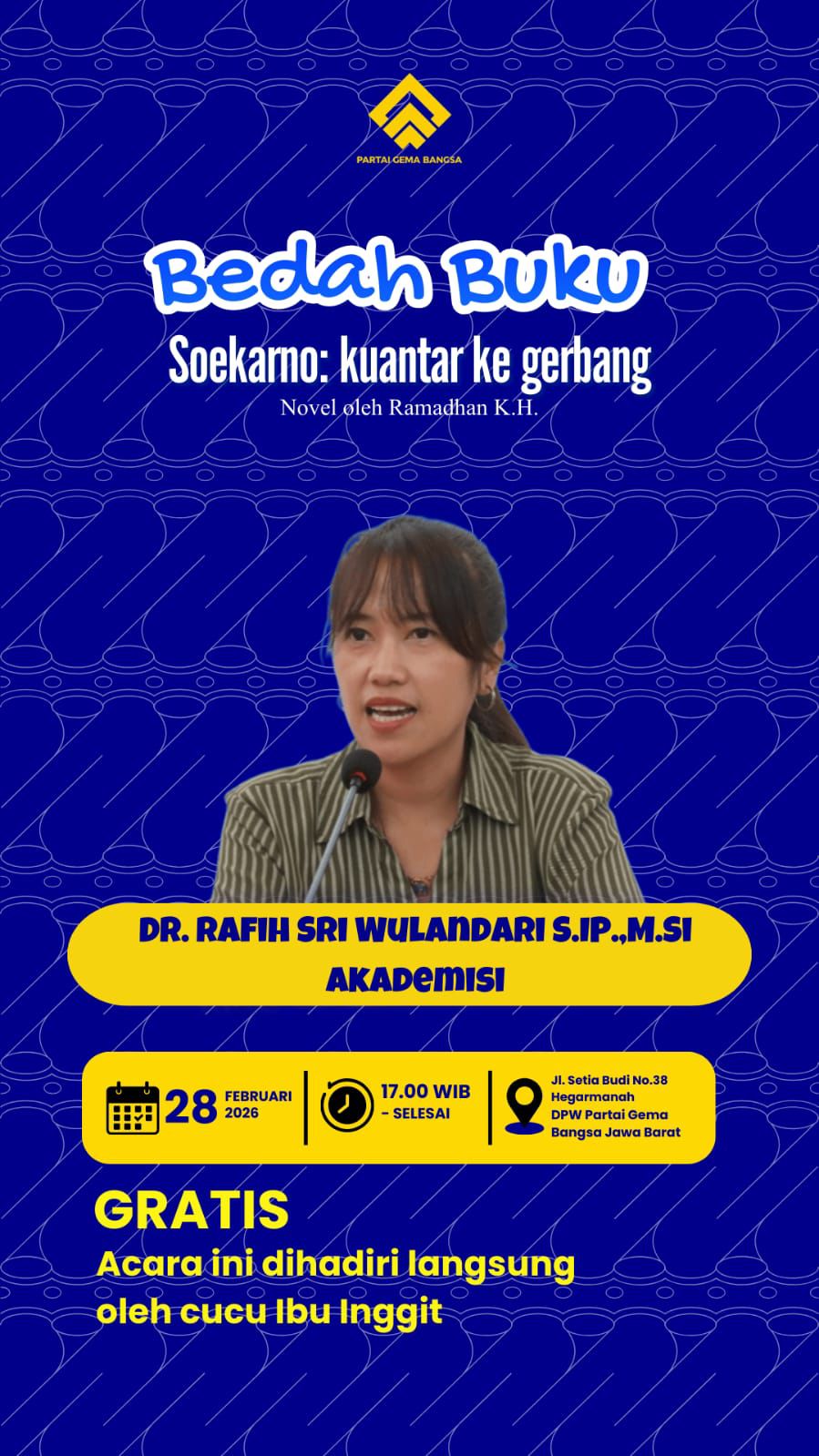 Kegiatan ini menghadirkan narasumber Dr. Rafih Sri Wulandari, S.IP., M.Si., seorang akademisi yang akan mengulas secara mendalam isi dan pesan historis dalam novel yang mengangkat sisi humanis perjuangan Soekarno, khususnya dalam fase kehidupannya bersama Inggit Garnasih.