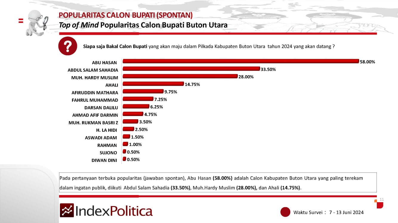 HALUAN BHUTAN UTARA – Index Politica yang baru merilis hasil survey pada tanggal 7-13 Juni lalu menempatkan 5 kandidat kuat untuk menduduki kursi Bupati Buton Utara .”Dari segi popularitas ada 5 kandidat yang moncer menduduki peringkat 1-5 yaitu ,Abu Hasan,Abdul Salam,M,Hardhy Muslim ,Ahali dan Arifuddin Mathara kelima kandidat punya kelebihan dan kekurangan masing-masing,” kata Hasrul.